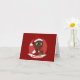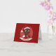 Lyckönskningskort med en illustration av en söt leende glad svart babyflicka eller pojke, bebisen har röda och vita kläder och håller en present; med redigerbar textmall för ditt namn eller meddelande, juldesign med röd bakgrund
