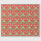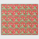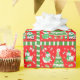 Gammaldags julillustration i rött och grönt med söta pälsiga ungar, valpar och hundar som bär tröjor och tomtehattar. En dekorerad julgran har presenter under sig. Hundben, stjärnor och gyllene bjällror pryder bilden.