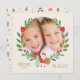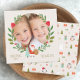 Framsida med krans och söt tomte - baksida med söta julmönsterdesign på baksidan med handritade natursymboler snömän, renar, järnek, snö,