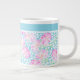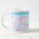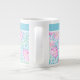 En mycket söt vit Jumbo Mugg, med mönster i rosa ros på en himlar blå bakgrund, prickad med vita fjärilar: från en handmålad vattenfärgsdesign av Judy Adamson. Du kan lägga till text i det enkla bandet överst eller bara lämna det rent.