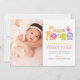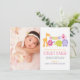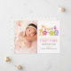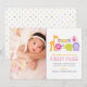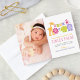 En parad av jungeldjurvänner — lejon, giraff, fågel, apa, elefant och flodhäst — välkomnar din babyflicka på detta glada porträttformat safari födelsekort. Porträttfotot är omgivet av prick- och randiga mönster på en ren vit bakgrund med inslag av livfulla rosa, grönt, orange och lila. All text är helt anpassningsbar.