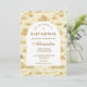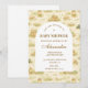 En söt saga-stil safari-design med skonsamma akvarell-baby djur inklusive lejon, giraffer och elefanter omgivna av mjuk djungelgrönska och en delikat botanisk bakgrund. Den varma neutrala paletten av kräm, honungsguld och mjuk oliv skapar en tidlös naturinspirerad estetik, medan den eleganta välvda layouten ger en vacker plats för evenemangsinformation.