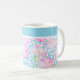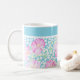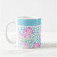 En mycket söt vit kaffe Mugg, med mönster i rosa ros på en himlar blå bakgrund, prickad med vita fjärilar: från en handmålad vattenfärgsdesign av Judy Adamson. Du kan lägga till text i det enkla bandet överst eller bara lämna det rent.