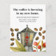 Detta söta flyttkort för kaffefanatiker har akvarellkonst med kaffekannor, en påse kaffebönor och botaniska accenter. Det ursprungliga citatet av Susan Coffey lyder "Kaffet bryggs i mitt nya hem". Anpassa med ditt namn, nya adress och telefonnummer. Baksidan av kortet har ett personligt meddelande och signatur med en liten kvist kaffebär. Designad av Susan Coffey.