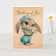 Detta hjärtvärmande ”Tänker på dig”-kort har en bedårande babykanin i teal overall och en matchande blomster mössa som erbjuder en söt bukett vita blommor. Med mjuka persikofärgade toner och ett ömt uttryck är denna design perfekt för att skicka tröst, uppmuntran eller en försiktig påminnelse om att någon har dem i tankarna. Mjuk, charmig och vacker upprättande.