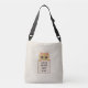 Vacker beige väska med en söt katt på fickan och ett meddelande: LIVET ÄR BÄTTRE MED EN KATT. Texten kan anpassas!