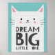 Snyggt rum eller barnkammare-plakat. Det finns en illustration av en vit katt med ett sött leende i ansiktet. På hennes mage finns ett inspirerande citat som säger "Dröm Stort Lilla En". Bakgrunden är i mintgrön färg. Perfekt för både flickors och pojkars rum.