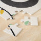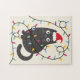 Julpussel med en söt katt med röd tomteluva och julgransbelysning.