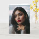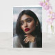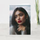 Tomt kort. Ai art på kortet är en ledsen Hispanic-kvinna med tårar i ögon som tittar ut genom fönstret och tittar på regnet.