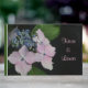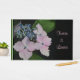 Den här gästen bok har en söt rosa lakecap hydrangea-blommar mot en mörk bakgrund. Den här bilden är ett slående påstående för bröllop, årsdagar eller förlovningar.