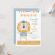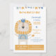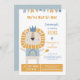 Rolig ordlek "We're Not Li-on!" festinbjudan för en liten pojkes ettårsdag med ett stolt lejon med en blå krona som bär en regnbågströja i nyanser av orange-guld och blå med text i matchande färger. Baksidan är en vacker dämpad blå. Fyll i din egen information i de mallfält som tillhandahålls.