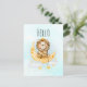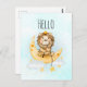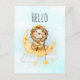 Hej vykort med en söt akvarellillustration. En bedårande lejon som bär en krona fiskar efter stjärnor sittande på en halvmåne som vilar på en fluffig moln. Magisk fantasillustration. Ljusblå akvarellbakgrund.