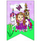 Den lilla gryningen med lila högdagrar i hennes hårprinsessa med en regnbågunicorn med ett slott, fjärilar och blommor i bakgrunden.