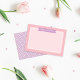 Ett stilfullt tack / vykort som innehåller en anpassad monogram-banner, rosa, lila och vita färger, prickar och en ramad yta för ett handskrivet meddelande.