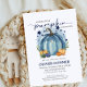 Fira att en söt liten pumpa kommer in med den här charmerande babyduschdesignen! Det här höstinspirerade temat har en mjuk blåfärgspumpa omgiven av falllöv och är perfekt för att välkomna ett pojke. Ord kan enkelt redigeras för att passa din specifika händelse. Färg och typsnitt i bakgrunden kan redigeras helt om du klickar på knappen "anpassa ytterligare".