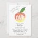 De här söta persikoinbjudningarna är perfekt för alla som firar sin första födelsedag. Utformningen har en handmålad vattenfärgspersika på en enkel vit bakgrund som är lätt att anpassa mallformuleringar.