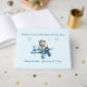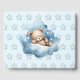 En söt nalle i ett blått flygplan flyger genom molnen med några stjärnor över. All text kan enkelt ändras till din information.
