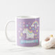 En färgrik och söt mugg med en söt liten vit enhörning med pastellfärgad man av röd och blå. Olika dekorativa element omger enhörningen som stjärnor, sockervadd, blommor, godis och lollipop, blomblad, hjärtan, popsicle glass, cupcake och regnbåge! Lila bakgrund kan ändras i anpassningsläge. Personliggör med flickans namn på banderollen.