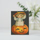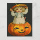 Kuckeliku! Detta vintage Halloween-kort innehåller en söt liten flicka som sticker ut huvudet ur en jack o' lantern.