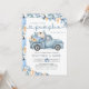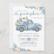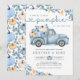 Höstbabyduschinbjudan med en rustik utformning som omfattar en plocka-upp-lastbil, pumpor och höst löv. Schemat för dammig blått och orange färg kompletteras med klassiskt serif-teckensnitt och datisskript.