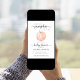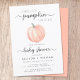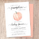 En söt, glad och ljus babyduschinbjudan med gender-neutralt med texten "En söt liten Pumpkin är på väg" skriven i en blandning av mjuk grått modern typografi och snyggt samt en pastellfärgad orange av en pumpkin. Under "babyduschen" står det i samma snyggt skript och du kan anpassa mor namn och duschdetaljer i minimal modern typografi.