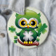 Söt liten St. Patrick's Day-uggla seriefigur som står på en gren och håller en Shamrock-klöver. Original vektor konst Copyright BluedarkArt TheChameleonArt