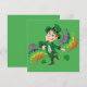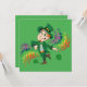 Inbjudan med en illustration av en söt lycklig leende och dansande läppjätte, han bär en grön kostym och en cylinder och är omgiven av regnbågsfärgade stänk