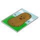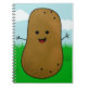 Färgglatt block med en söt tecknad glad brun potatis som leker i trädgården. Bakgrund av en blå himmel med två vita moln och lite fin grön gräs.