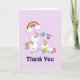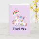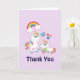 Söt tackkort med en vit mamma enhörning med färgrik man och svans. En baby enhörning som ligger bredvid henne, med en grön napp i munnen. En färgrik regnbåge med ludna moln, och några stjärnor och hjärta pryder denna söta och bedårande design. En fet rosa kontur runt bilden ger den en barnslig klotter-känsla. Ljus lila bakgrund.