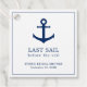 Nautiska bröllopsduschfavoritmarkörer med ett marinblått ankare och meddelandet "Sista seglingen före slöjan", samt ditt namn, evenemangstitel och datum, inom en ram, på en vit bakgrund. Baksidan är i matchande marinblått och kan ändras till valfri färg. Dessa enkla markörer är perfekta för en kustfirande sommarfest och lägger till en personlig touch till era favoriter.