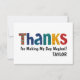 Uttryck din tacksamhet med detta söta moderna tackkort! Med lekfull typografi med färgglada bokstäver i röd, blå och gul färg fångar det en glad och livlig barnslig stil. Ordet "tack" är kreativt stavat, vilket gör det både roligt och iögonfallande. Baksidan är en klar gul färg, vilket bidrar till kortets soliga och glada känsla. Anpassningsbar svart text låter dig lägga till ett personligt meddelande och signatur, vilket gör det perfekt för alla tillfällen. Detta söta och moderna tackkort kommer säkert att ge en glad smile till någons ansikte, och fira konsten att säga tack på ett förtjusande sätt.