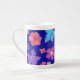 En söt Bone China Mugg som ska anpassa sig, med en mönster av blommor i lila, turkos, rosa och orange på mörk blått bakgrund, från en handmålad papper kollage av Judy Adamson.