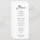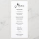 Det här enkla och snyggt-, svartvitt-menykortet i bröllop har visuell, vintage stil-skripttypografi. Lägg till dina val av middag för nybörjare eller aptisatorer, första kurs, huvudkurs eller entré, och desserter. Ett elegant, ett klassiskt minimalistiskt utseende som fortfarande är unikt och contemporary och som är perfekt för antingen din bröllopsmottagning eller repetitionsmiddag, eller för möhippa eller par duschmat.