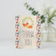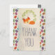 Ett tackkort med en teckning av en söt räv som sover fridfullt. En krans av gröna blad bakom. Bakgrunden är ett mönster med bleka prickar och färgglada makaroner överst. Personligt meddelande på baksidan.