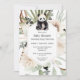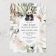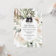 En förtjusande och charmerande inbjudan till baby shower med en akvarellbjörn och frodig växtlighet är det perfekta sättet att sätta tonen för en glädjefylld fest. Runt björnen skapar grön, brun och krämfärgad växtlighet en naturlig och inbjudande atmosfär. Uttrycket "Vi kan knappt vänta" är elegant inkorporerat i designen på baksidan av inbjudan och anknyter på ett smart sätt till björntemat samtidigt som det uttrycker förväntan och spänning inför den kommande ankomsten. Texten är skriven med en söt och udda teckensnittsstil som kompletterar inbjudans övergripande estetiska uttryck. Med sin kombination av förtjusande konstverk, naturinspirerade element och ett lekfullt