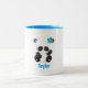 Kaffet mugg är till panda älskare. Två tonade mugg har en blå insida med vit bakgrund på utsidan. Framtill och mitt är en svart och vit panda som bär en blå blomma i håret ovanför hennes öra på högerna. Den blå blomman matchar den blå på insidan av mugg. Under pandan är ett ställe som anpassar ditt namn i blått. Du kan välja ett annat färg-teckensnitt om du väljer och t.o.m. ett helt nytt teckensnitt.
