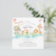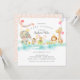 Bedårande baby shower inbjudan med en parad av djur med kronor, ballonger, musikinstrument och flaggor. Perfekt design för en vanlig, virtuell eller drive-by baby shower. Vänd på vår inbjudan för att se en damastbakgrund för en extra speciell touch.