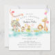 Bedårande baby shower inbjudan med en parad av djur med kronor, ballonger, musikinstrument och flaggor. Perfekt design för en vanlig, virtuell eller drive-by baby shower. Vänd på vår inbjudan för att se en damastbakgrund för en extra speciell touch.