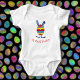 En söt påskkanin i form av ett påskägg, dekorerad med prickar, ränder och sicksack i rött blått och gult. Den medföljande texten i en matchande djupröd färg kan redigeras, eller så står det "MIN FÖRSTA PÅSK" som standard.