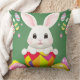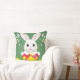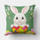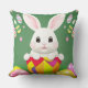 Helgtematisk illustration med en glad vit kanin omgiven av färgglada påskägg och gräs.