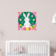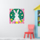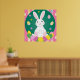 Helgtematisk illustration med en glad vit kanin omgiven av färgglada påskägg och gräs.