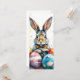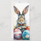 En charmig påskillustration av en söt kanin omgiven av vackert målade ägg, vårblommor och en fjäril. Mjuk akvarellton och lekfulla detaljer skapar en glad vårstämning som firar påsk och förnyelse.