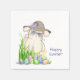 Påskhare med hatt och solglasögon med ägg och blommor i gräs