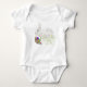 En barnkroppsdräkt, en klänning med en originell illustration av en realistisk kanin och färgglad korg med påskägg