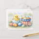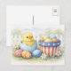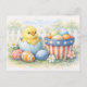 Det här charmiga vykortet i akvarell visar en luddig kyckling som kläcks ur ett pastellfärgat ägg, omgivet av vackert dekorerade påskägg, ömtåliga vårblommor och en festlig korg med en subtil patriotisk touch. Den mjuka, handmålade stilen skapar en varm och glad känsla, vilket gör den perfekt för påskhälsningar, vårfirande eller för samlare av söt och fantasifull konst. Idealiskt för att skicka glada säsongsönskningar eller för att lägga till en söt touch till din vykortssamling.
