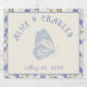 Sötärta: vin-etiketten med gnistrande bröllop med blå fjäril, par namn och bröllop på gräddbakgrunden i blommigt ram
