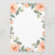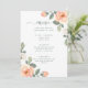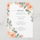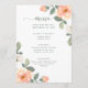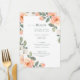 Det här fina bröllop-menykortet har trendig persiko- och vitblommor med många grönt löv och modern skripttypografi på en ren vit bakgrund.
