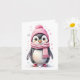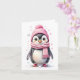 En bedårande pingvin i rosa mössa och halsduk väntar på din personliga hälsning för detta tomma julkort.
