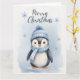 En charmig vinterillustration av en bedårande liten pingvin som bär en blårandig mössa och halsduk, som ger en mysig och festlig stämning. De mjuka snöflingorna och de milda blå nyanserna i bakgrunden skapar en magisk vinteratmosfär. Perfekt för julkort, affischer, klistermärken och säsongsbetonade hantverk!