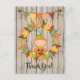 Det här höstkortet med texten Tack! har en söt bebis iklädd pumpakostym som sitter i en krans av färgglada höstlöv. Det finns också en flaggstångsbanderoll med ekollon och en falsk trähydd bakgrund.